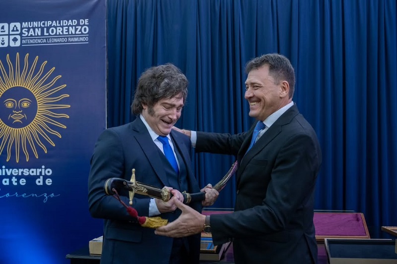 Antes del acto central, el intendente Leonardo Raimundo le entregó a Milei una réplica del sable corvo de San Martín. El gesto tuvo un fuerte impacto emocional en el Presidente, que se mostró visiblemente conmovido. El obsequio funcionó como un puente simbólico entre la historia sanmartiniana, la ciudad de San Lorenzo y la narrativa épica que Milei buscó imprimirle a su visita.